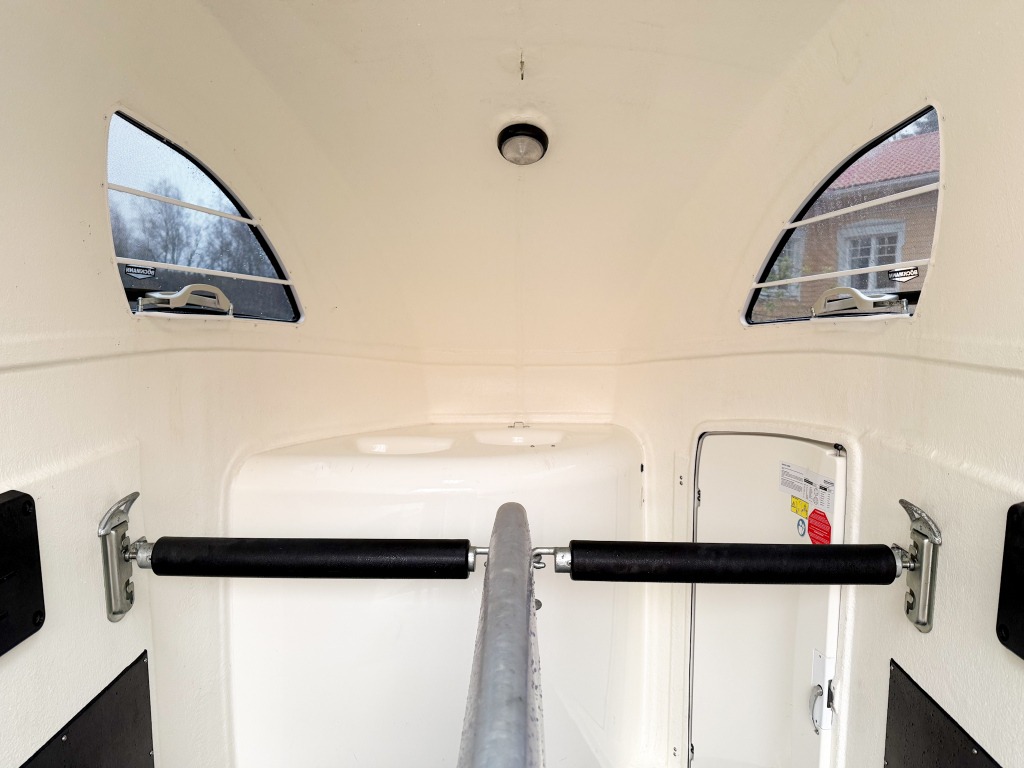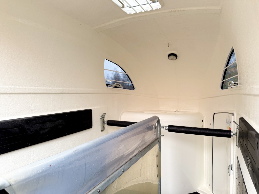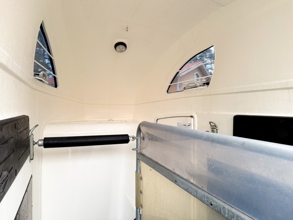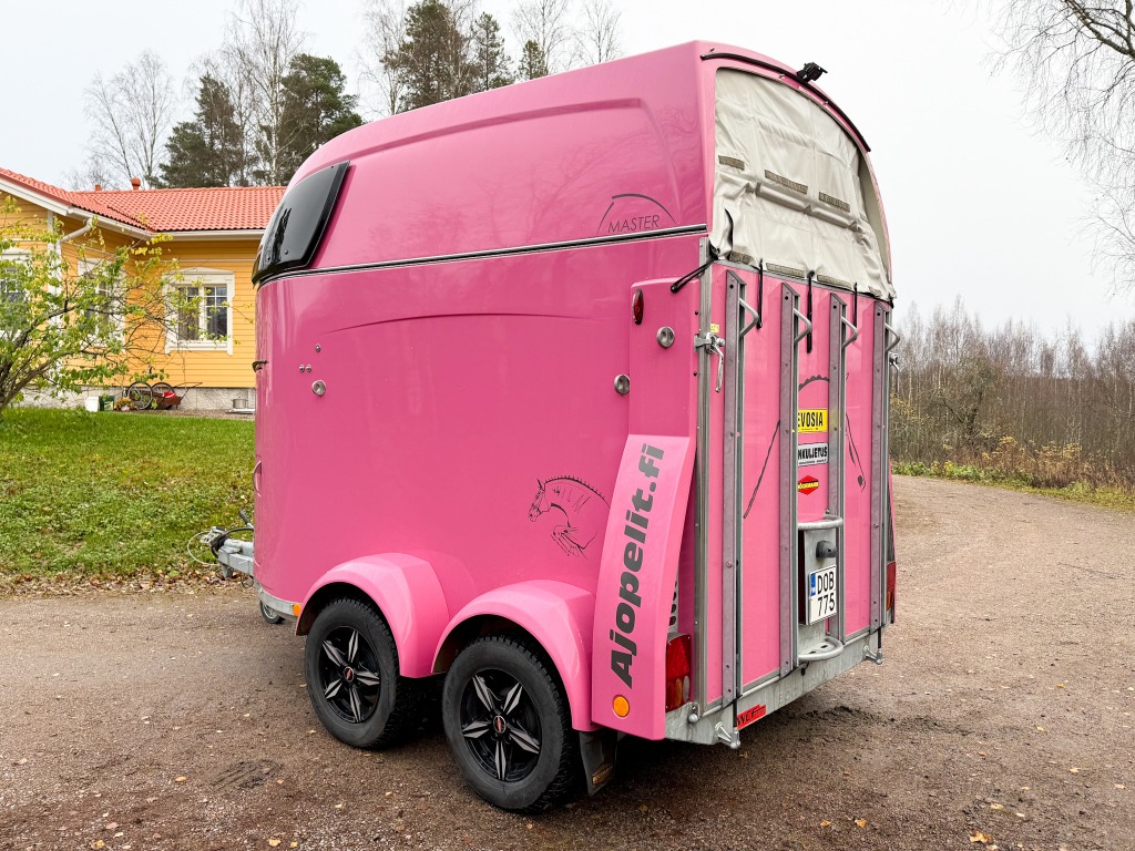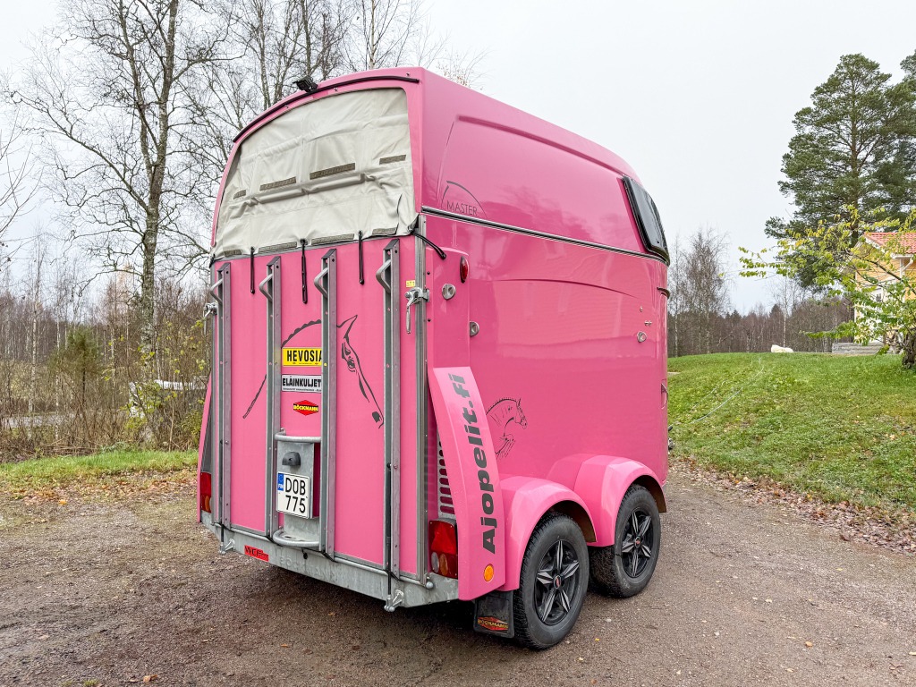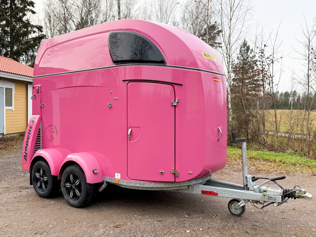 Hinta alv 0 11872,-, ilman käsirahaa ja kaskoa alk. 217,-/kk. Kokonaismassa 2400kg, omapaino 726kg = kantavuus 1674kg. Hevostilan sisäpituus 325cm, sisäleveys 165cm, sisäkorkeus 235cm.Erikoisväri magenta, Böckmannin Master missä on alustassa WFC-erikoisjousitus. Hevostilassa on ruokintapöytä, uudesta asti ollut paksu hokkimatto, puomeissa MSS (Multi Safe System) -kiinnitys paniikkivapautuksella, avattavat ikkunat ja kattoluukku, valo, pitkät puomit mukana. Varustetilassa on säädettävät satulatelineet, hyllytaso, jakkara, lapio ja harja. Avaimetkin löytyy.