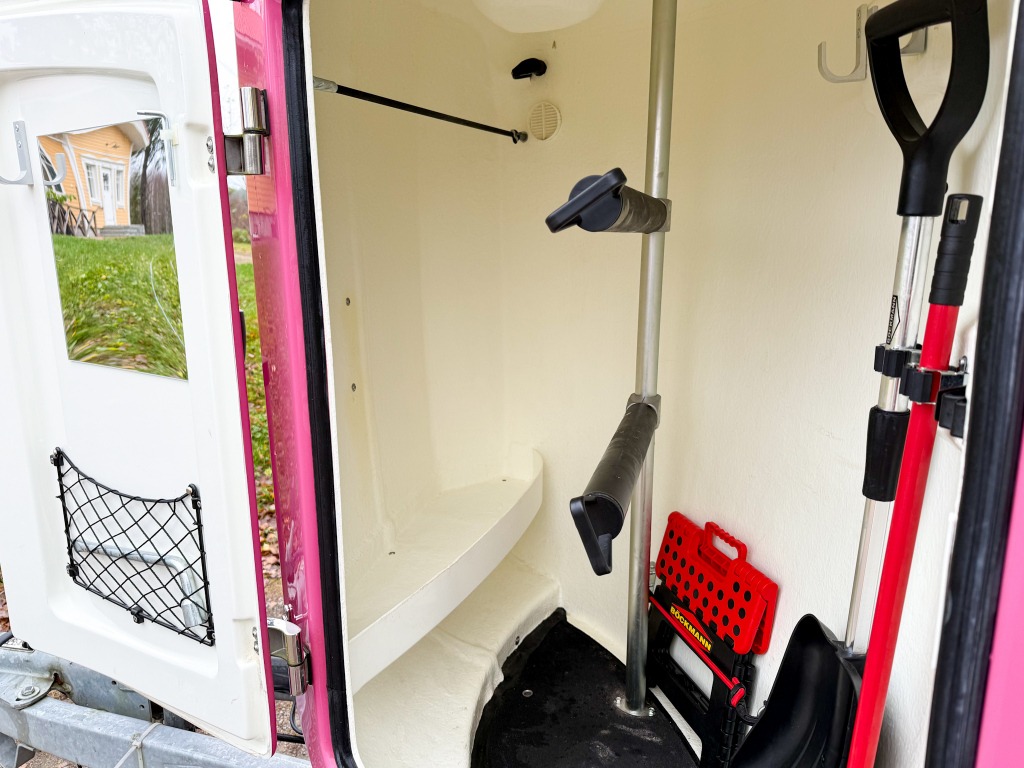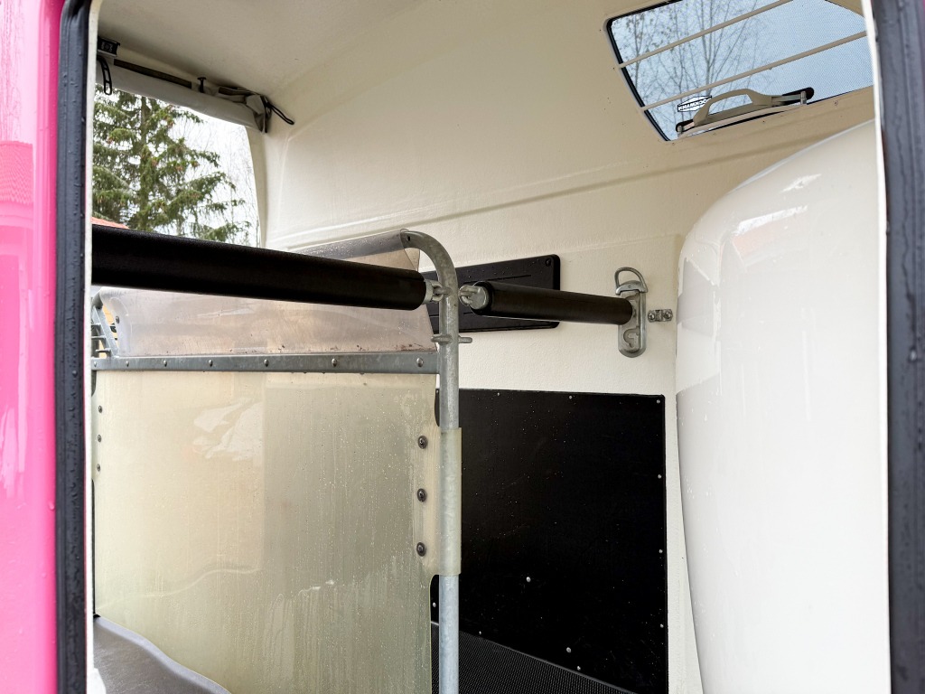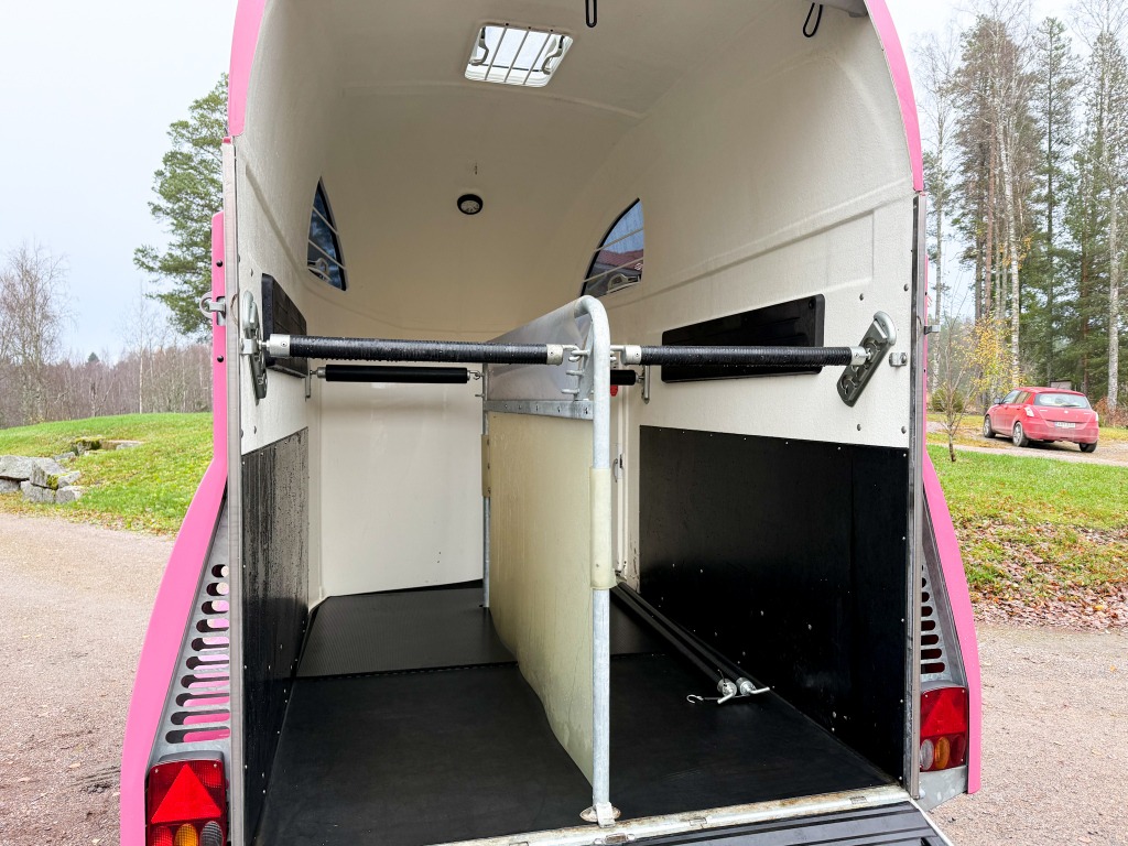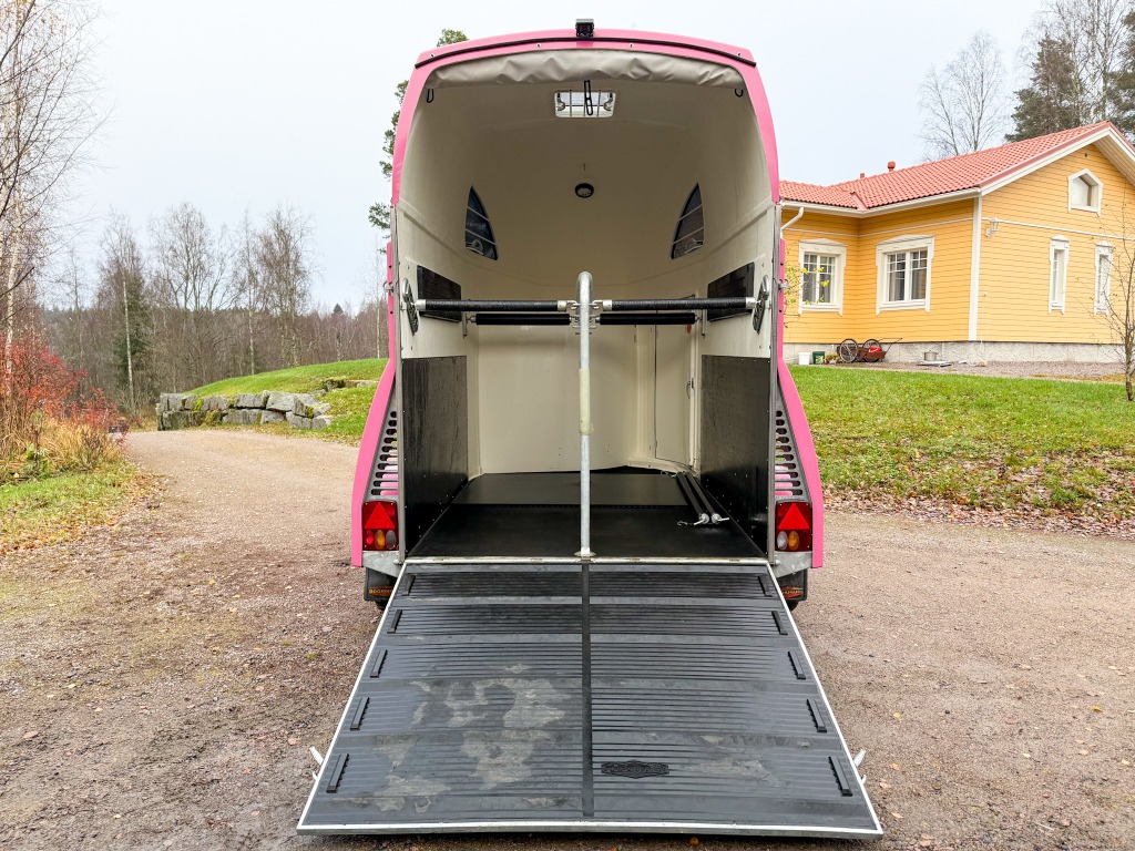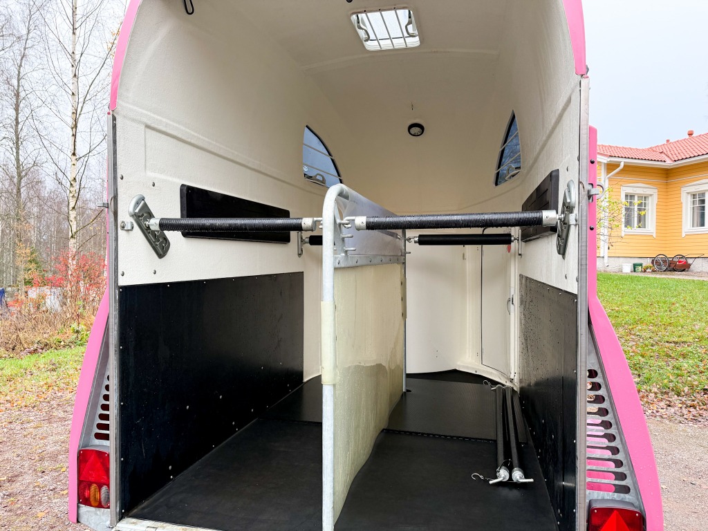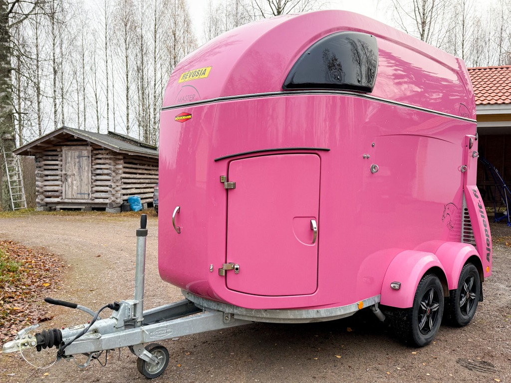 Erikoisväri magenta, Böckmannin Master missä on alustassa WFC-erikoisjousitus. Hevostilassa on ruokintapöytä, uudesta asti ollut paksu hokkimatto, puomeissa MSS (Multi Safe System) -kiinnitys paniikkivapautuksella, avattavat ikkunat ja kattoluukku, valo, pitkät puomit mukana. Varustetilassa on säädettävät satulatelineet, hyllytaso, jakkara, lapio ja harja. Avaimetkin löytyy.