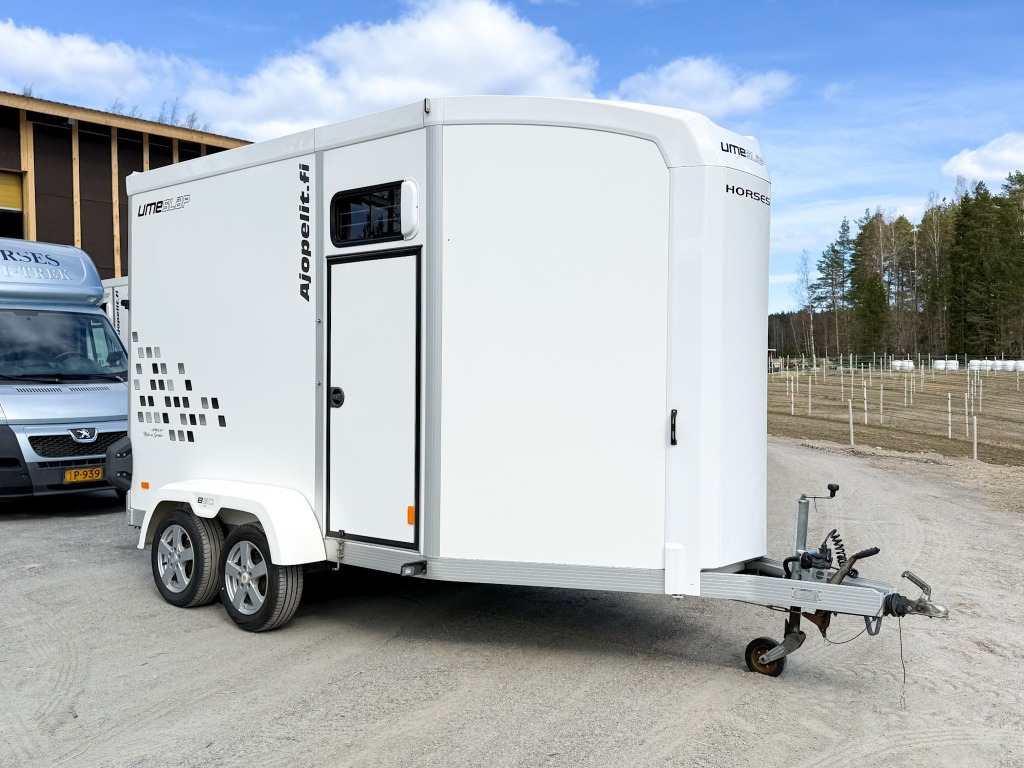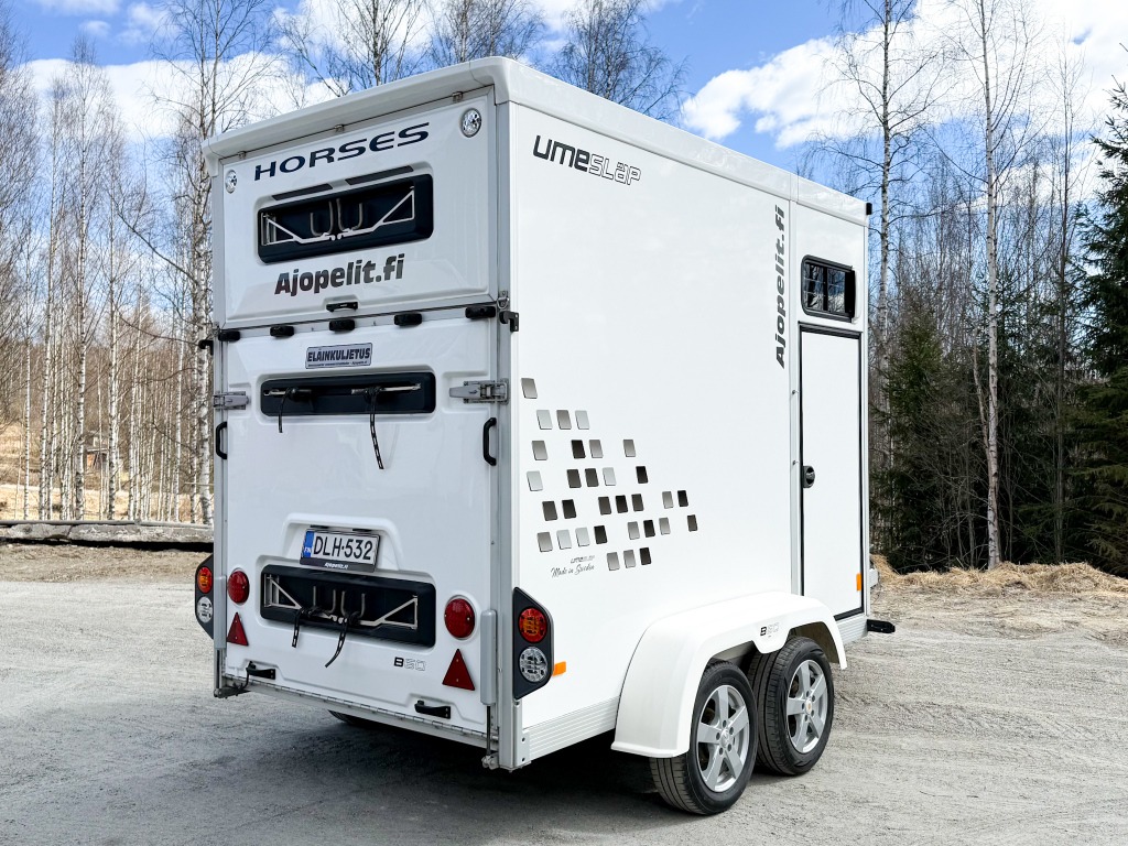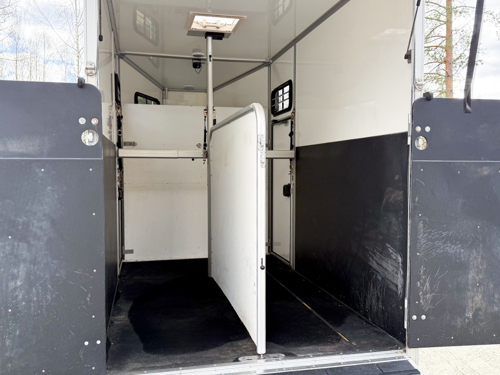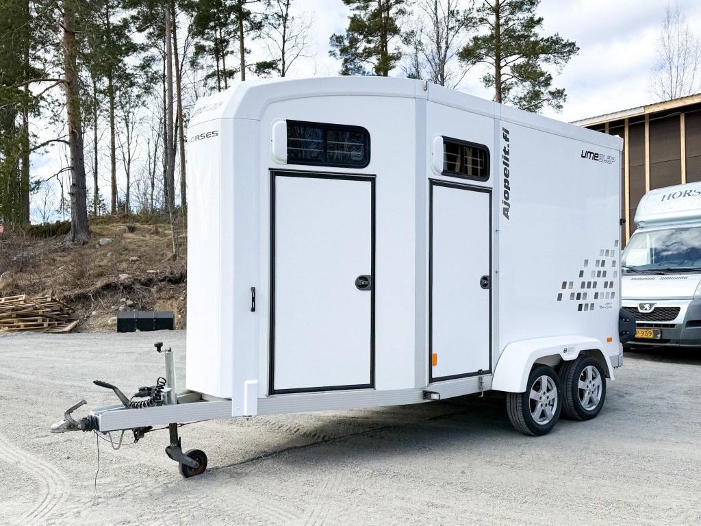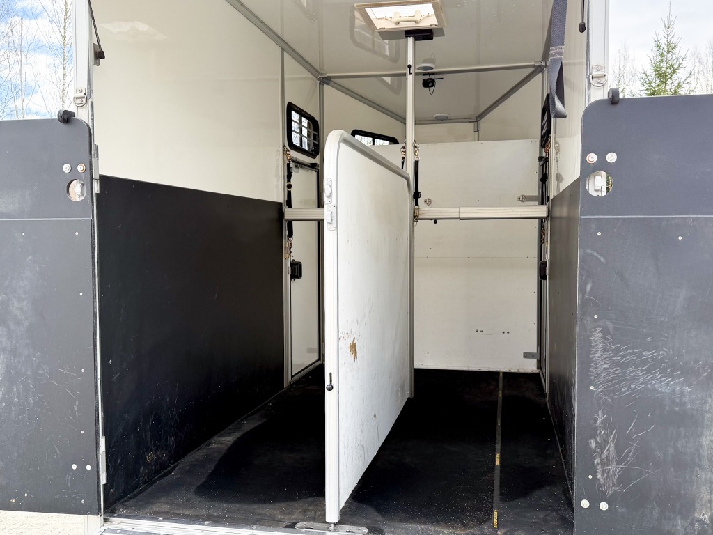 10% käsirahalla alk. 257,-/kk. Ilman käsirahaa alk. 306,-/kk.Todella hieno hevostraileri vakaalla alustalla ja isolla varustetilalla! Trailerissa on alumiinipohja, -runko ja -silta. Hevostilan sisämitat: korkeus 230cm, pituus 290cm, leveys 175cm. Hevosten puolet saa muutettua erikokoisiksi helposti. Löytyy kamera, potkusuojat, kattoluukku, avattavat sivuikkunat, virheetön matto sisällä ja sillassa. Varustetilassa on satulatelineet, suitsitelineet, lämpömittari. Kahdet hyvät renkaat.