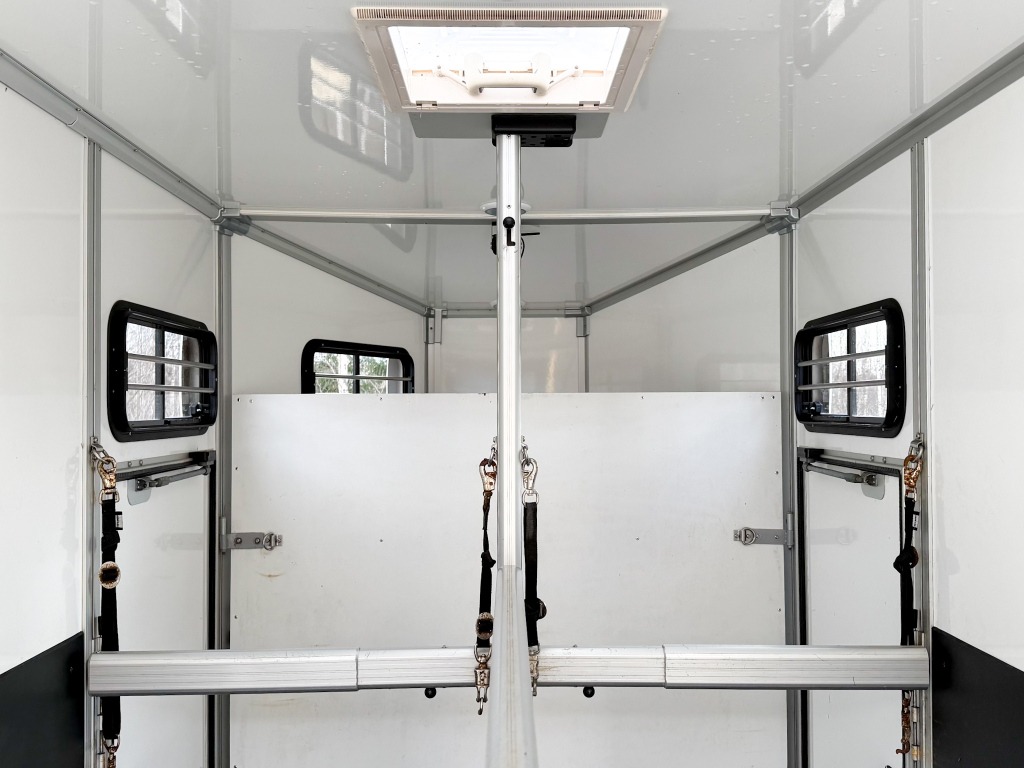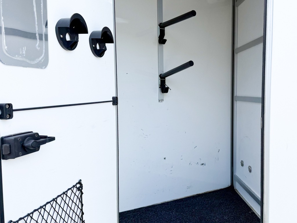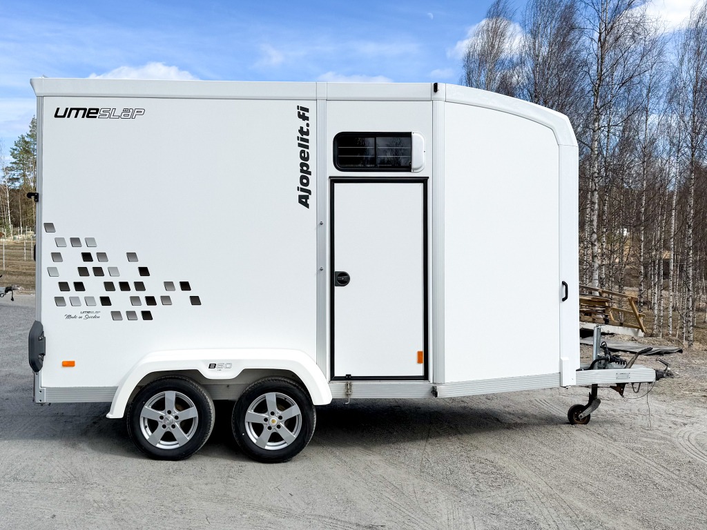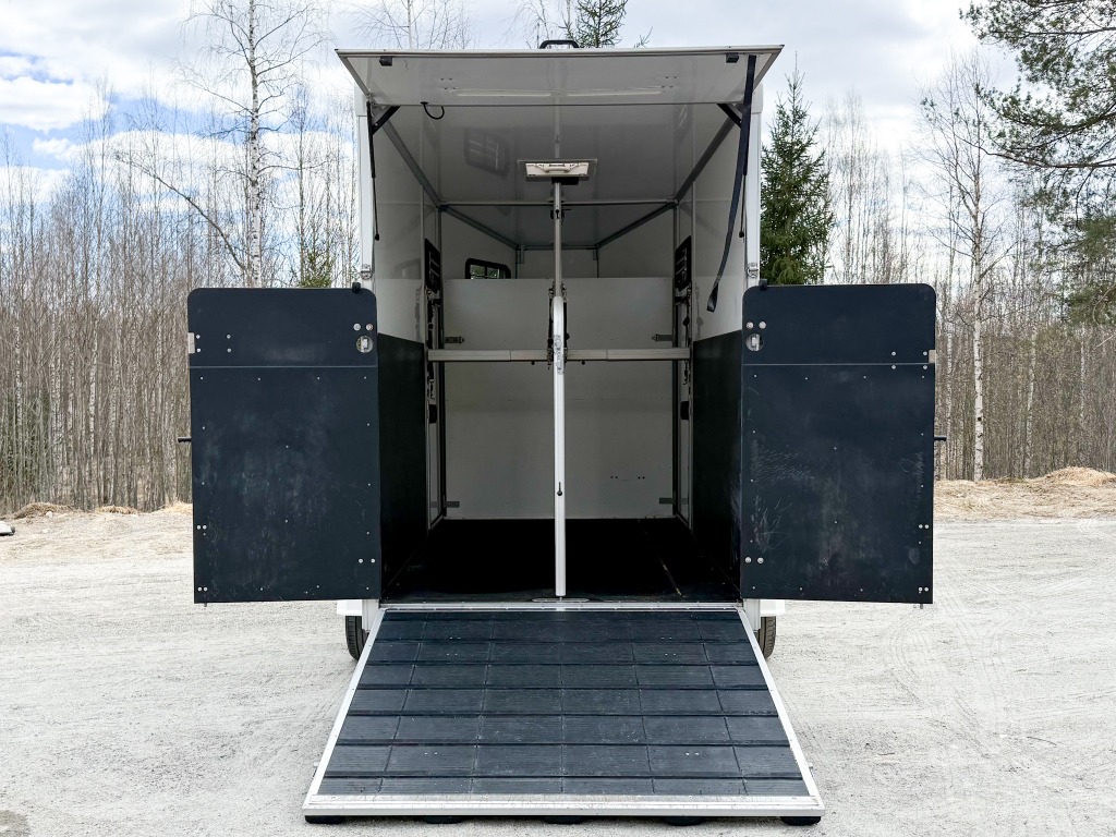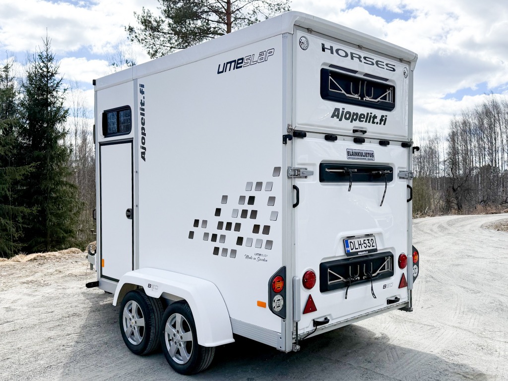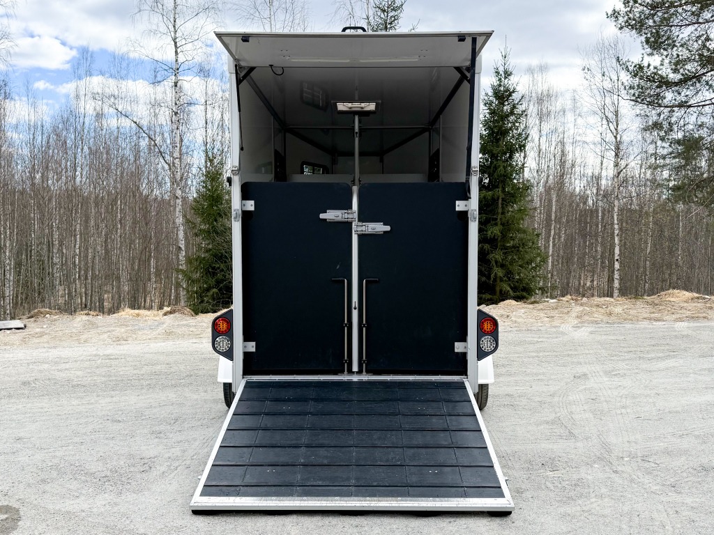 10% käsirahalla alk. 257,-/kk. Ilman käsirahaa alk. 306,-/kk.Todella hieno hevostraileri vakaalla alustalla ja isolla varustetilalla! Trailerissa on alumiinipohja, -runko ja -silta. Hevostilan sisämitat: korkeus 230cm, pituus 290cm, leveys 175cm. Hevosten puolet saa muutettua erikokoisiksi helposti. Löytyy kamera, potkusuojat, kattoluukku, avattavat sivuikkunat, virheetön matto sisällä ja sillassa. Varustetilassa on satulatelineet, suitsitelineet, lämpömittari. Kahdet hyvät renkaat.